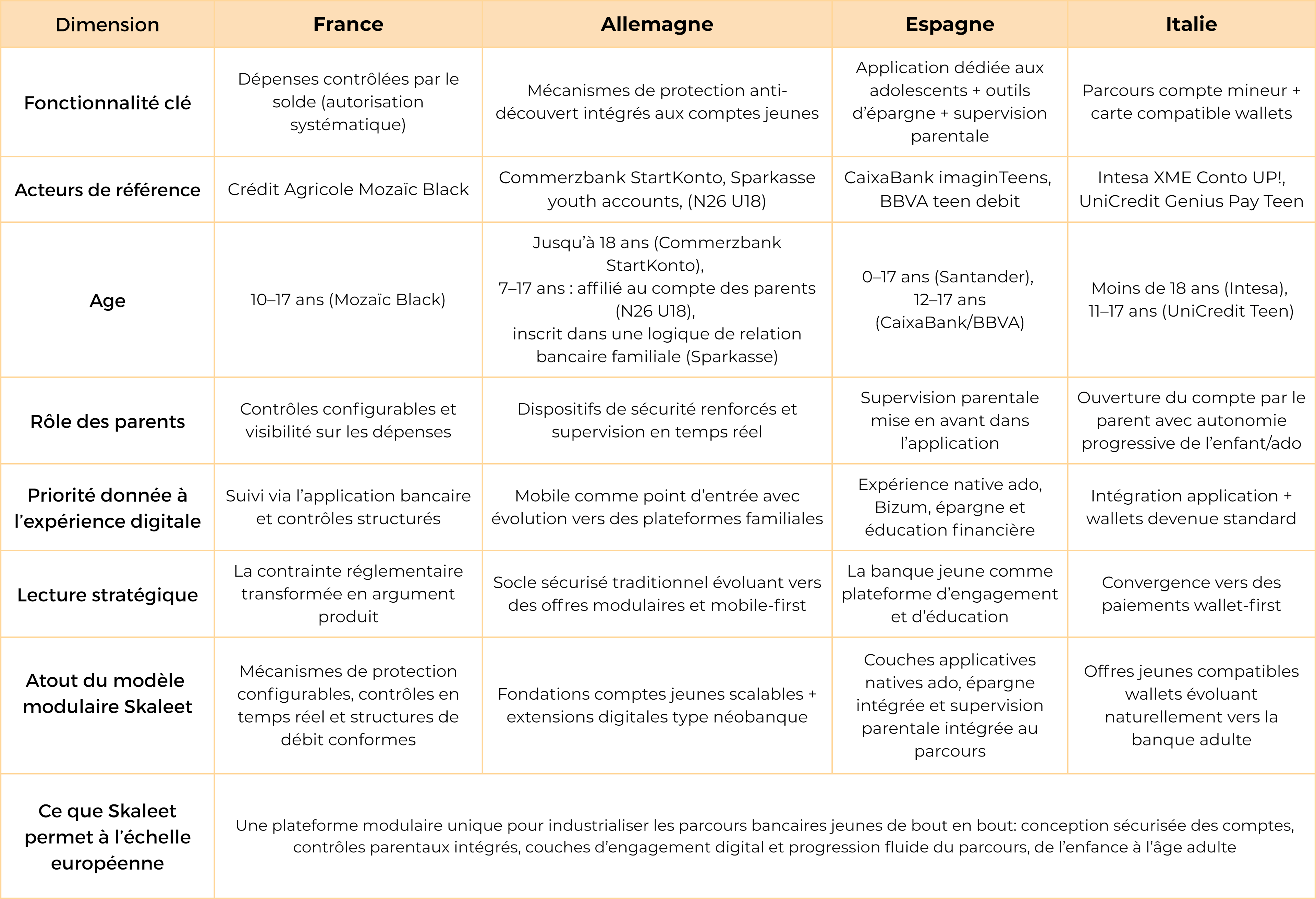 Les différences entre pays et entre établissements concernent principalement le point de départ du parcours, la rapidité d’intégration des wallets, des dispositifs d’éducation financière et de l’onboarding digital, ainsi que l’entité considérée comme titulaire principal de la relation bancaire, l’enfant ou le parent.