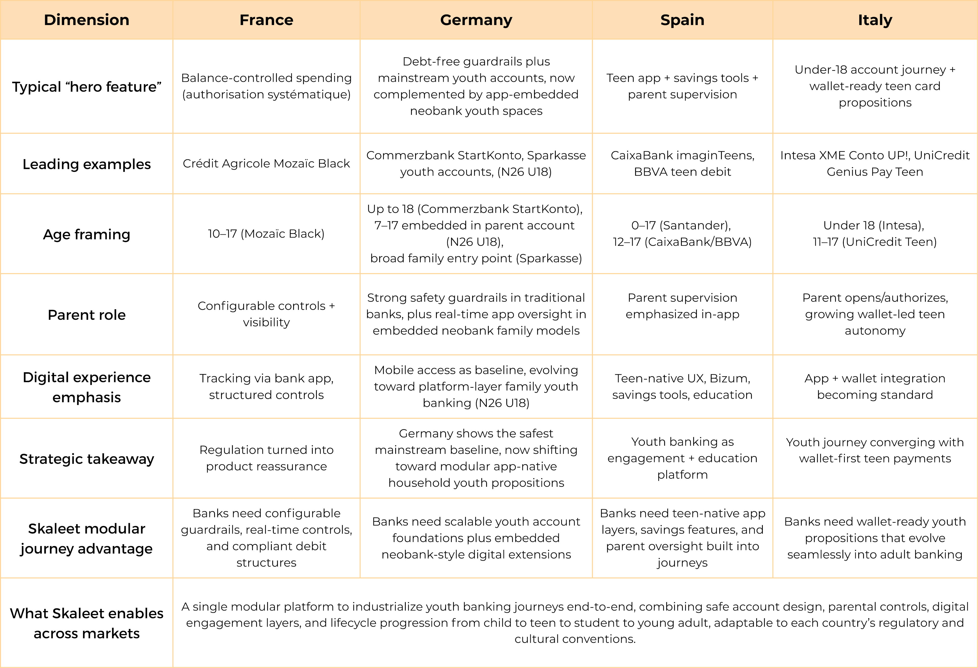 Differences between countries and offerings mainly concern when the journey starts, how quickly wallets, education, and digital onboarding are introduced, and which client type the bank designates as the primary relationship holder - the child or the parent.